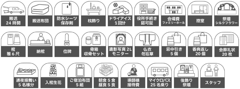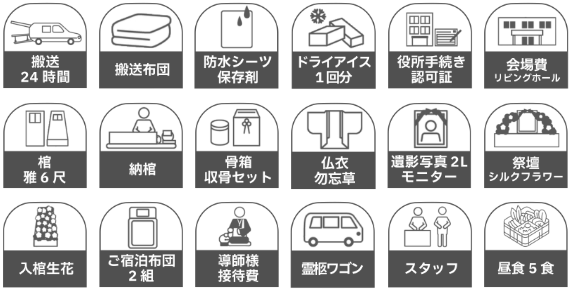 ※返礼品、飲食費、お布施などは含まれません。また、火葬料金は実費をご遺族様にてご負担ください。
