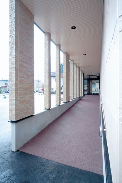 駐車場から段差のないゆるやかなスロープにより、車椅子やお年寄りにも配慮したバリアフリー設計を実現しています。