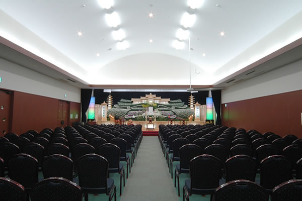 最大300名を収容できるメインホールは、吹き抜け天井により解放感にあふれ、立体感ある祭壇や視界を遮らない格納式スクリーンは参列者の記憶に残るセレモニーを演出できます。